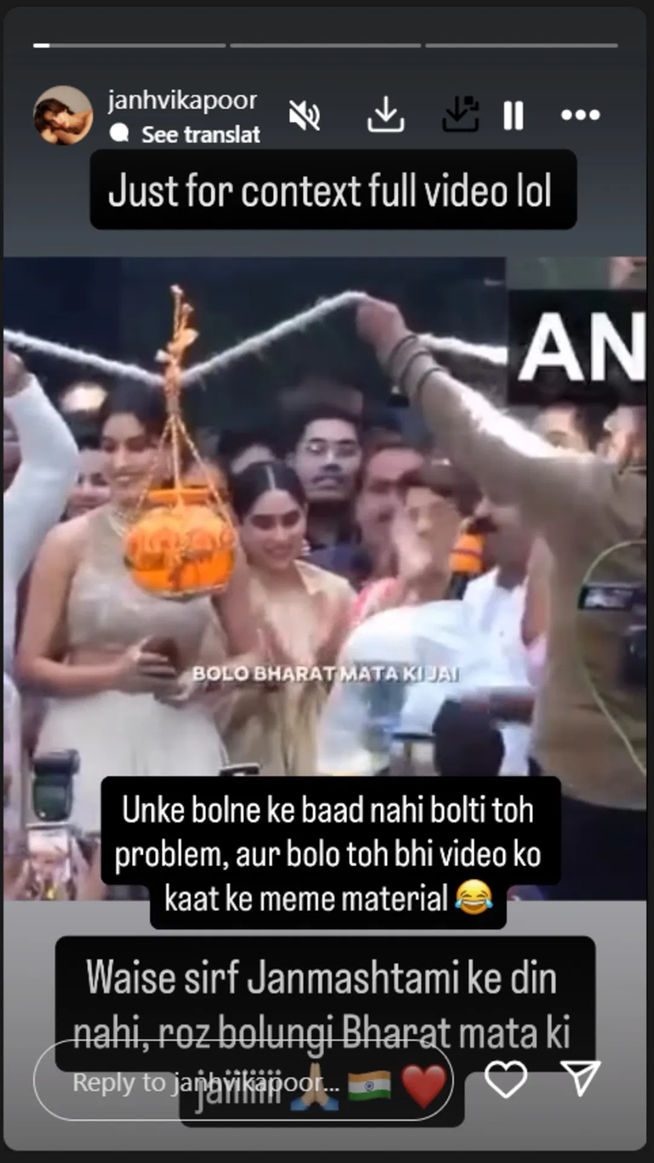 Janhvi Kapoor shared the entire video of Janmashtami on her Instagram and wrote, 'The entire video for you. People also shouted Bharat Mata Ki Jai at the event. If you don't say it after they say it, then it's a problem, and even if you say it, you use the video as meme material. Well, not just on Janmashtami, I will say Bharat Mata Ki Jai every day.'