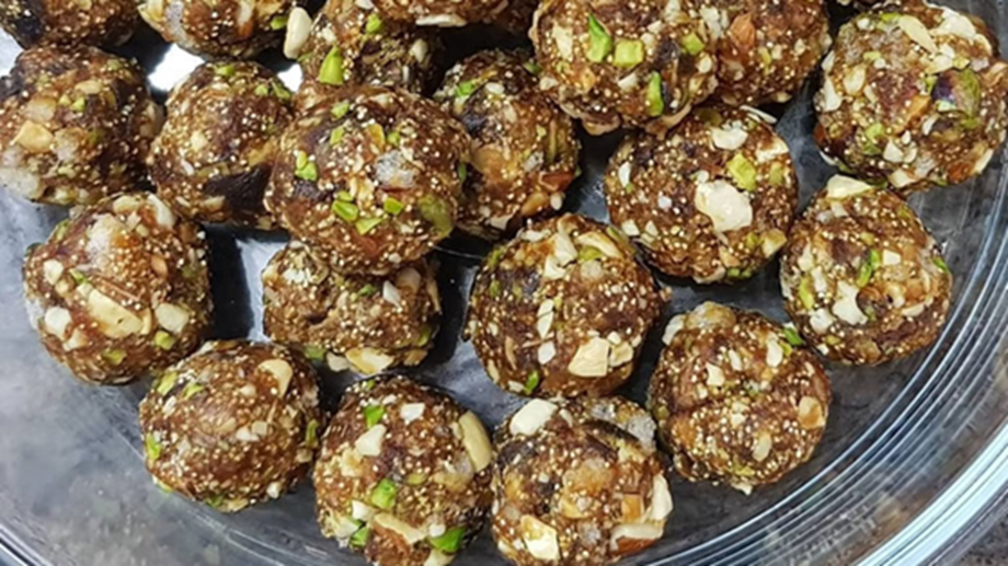 Fry the gum in a pan with ghee till it turns golden. On the other hand, fry the flour in ghee till it turns golden. Then mix both, add powdered sugar and nuts, and mix well. Make laddus when it cools down.