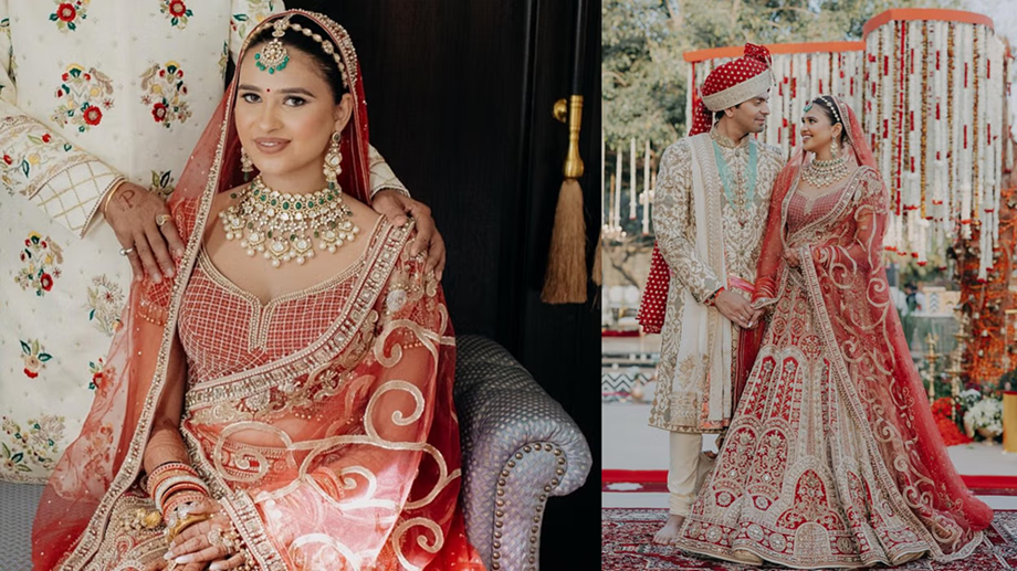 Apart from the dupatta, to complete her look, she adopted a completely traditional bridal look by wearing Kundan jewelry and a headband. Her bridal look is ruling everyone's hearts. Wearing bangles on mehndi-applied hands, Agrata kept her makeup nude, which looked perfect for a day wedding.