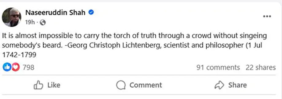 After deleting the post made on Monday, Naseeruddin Shah wrote a cryptic message on Facebook on Tuesday. In this, the actor has shared an idea of the scientist and philosopher George Christoph Lichtenberg. He wrote in the message, 'It is almost impossible to carry the torch of truth among the crowd without burning someone's beard.' As soon as this new post of the actor came, users gave mixed reactions. Some are criticizing him, while some are defending his right to freedom of expression.