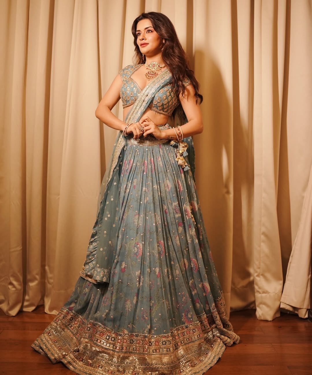 In these photos, the actress is seen wearing a gray designer lehenga.