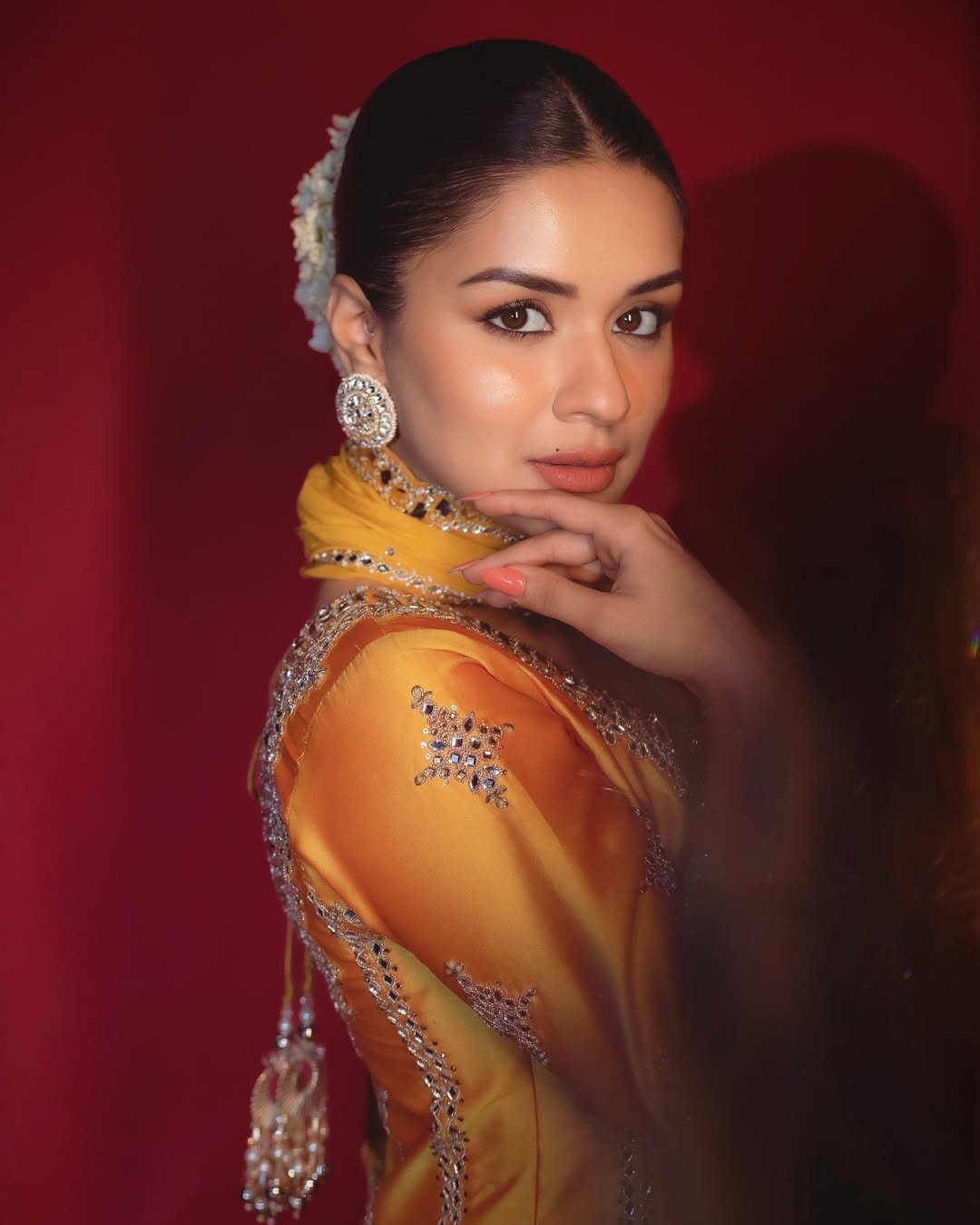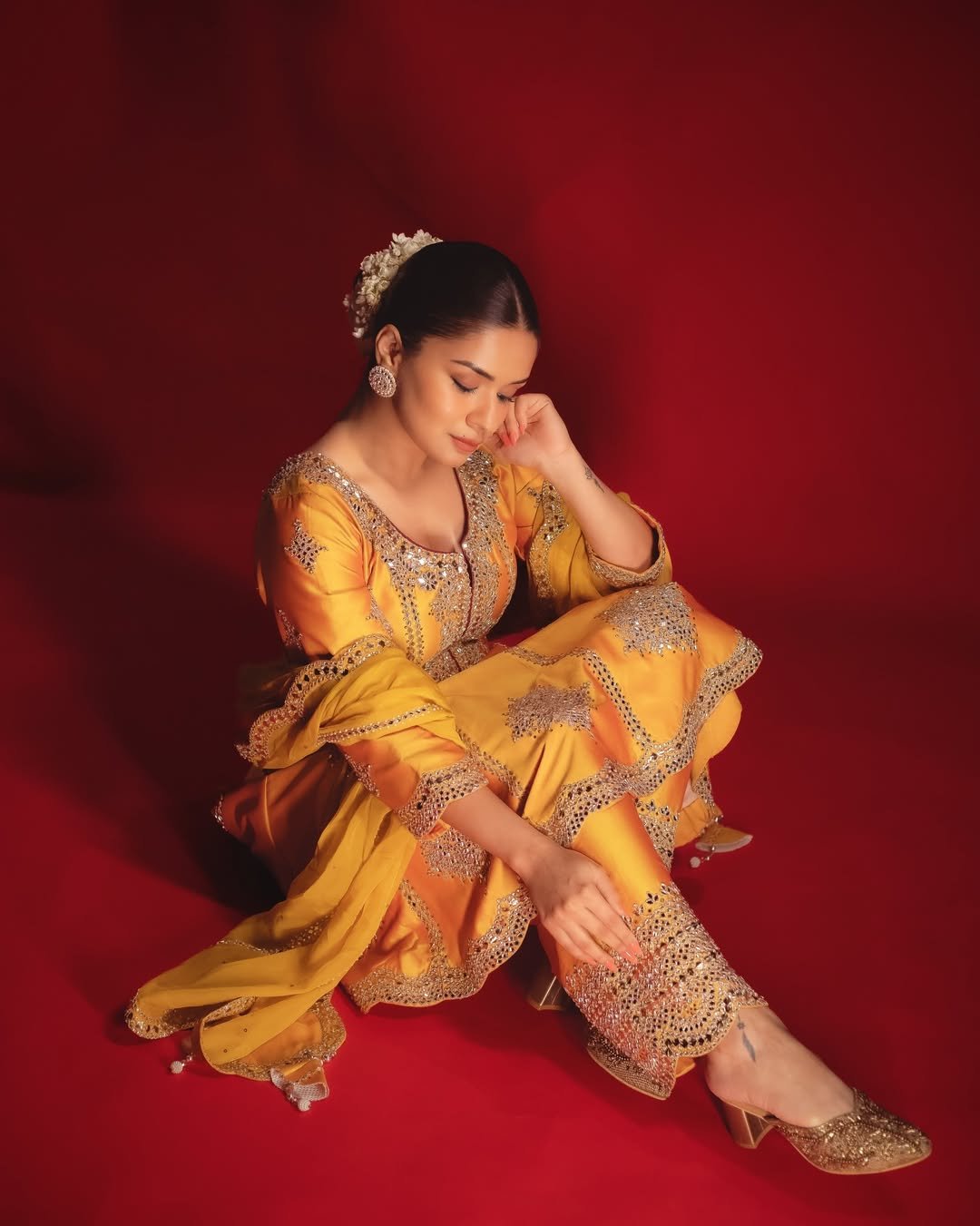 It can be seen in the pictures that she has given many poses in a traditional yellow dress.