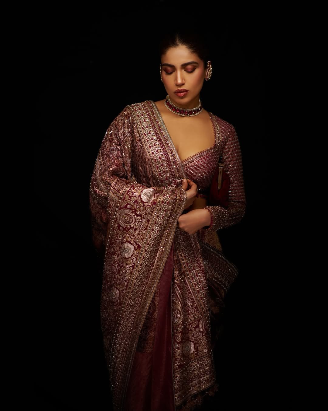She is seen in a wine-colored traditional dress.