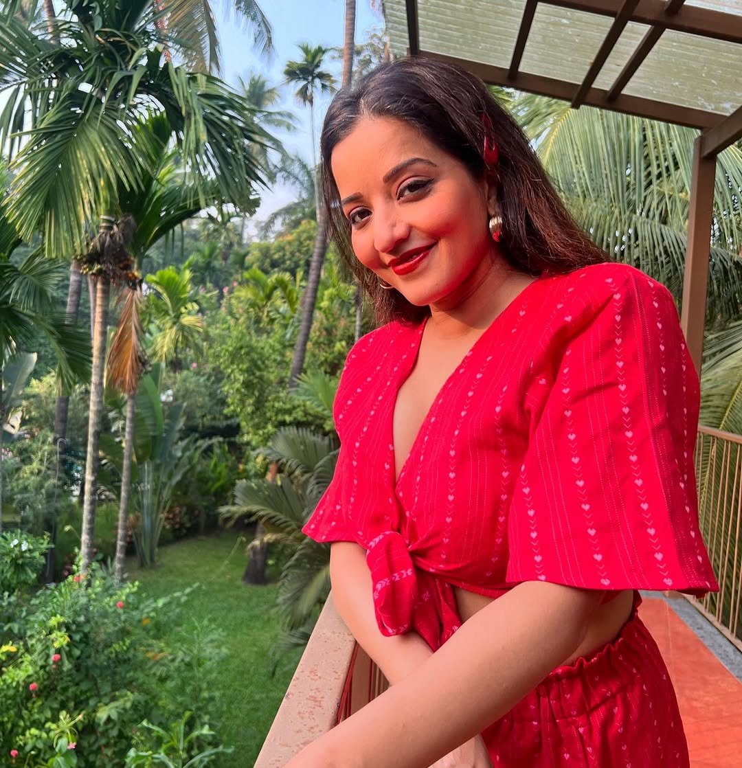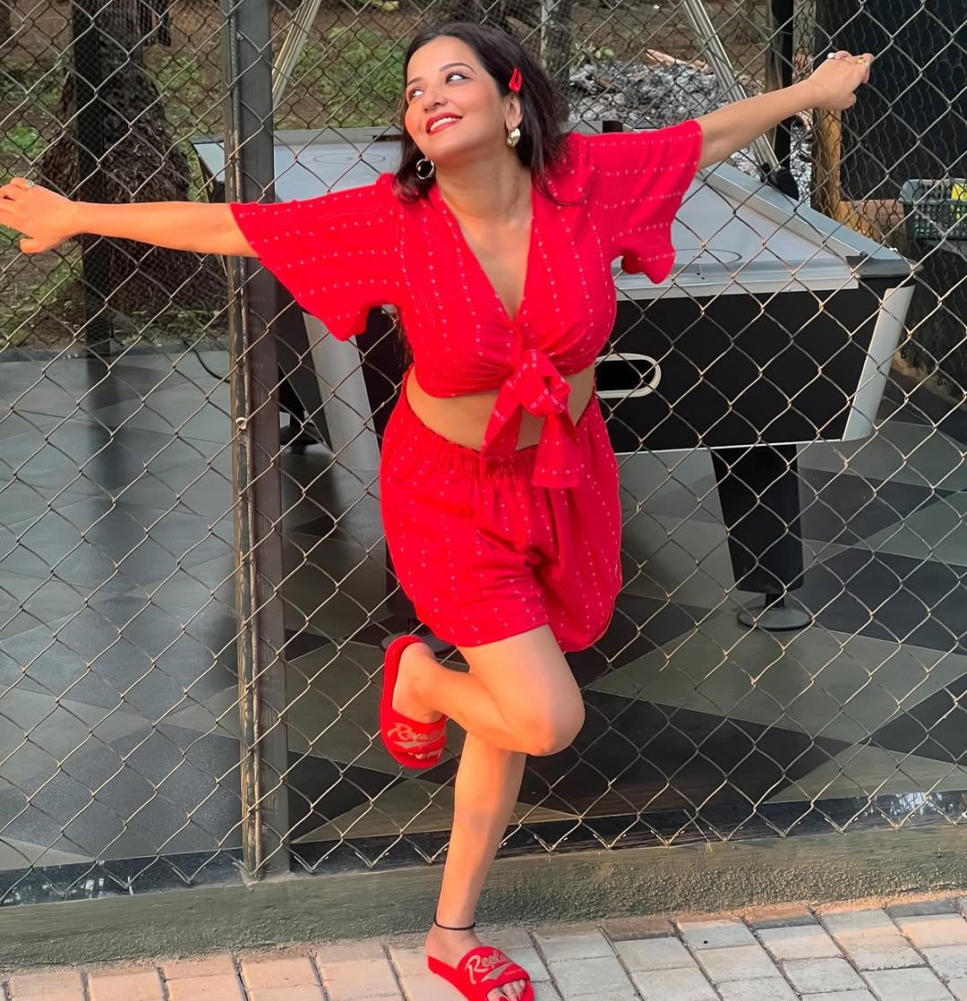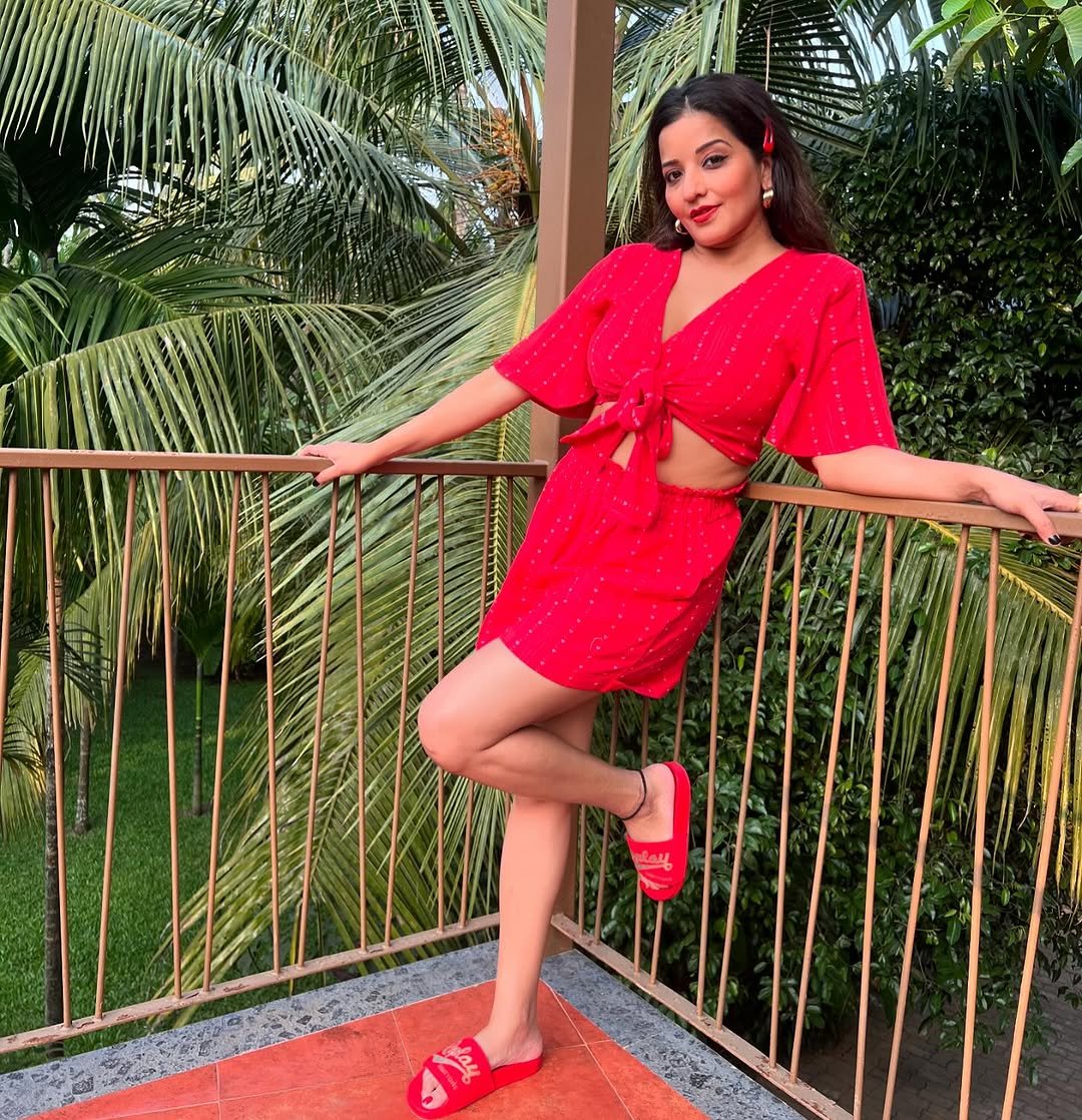 In these pictures of Monalisa, you can see that she is wearing a very sexy outfit of red color, in which she is looking very beautiful and glamorous.