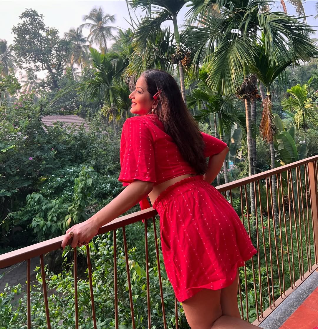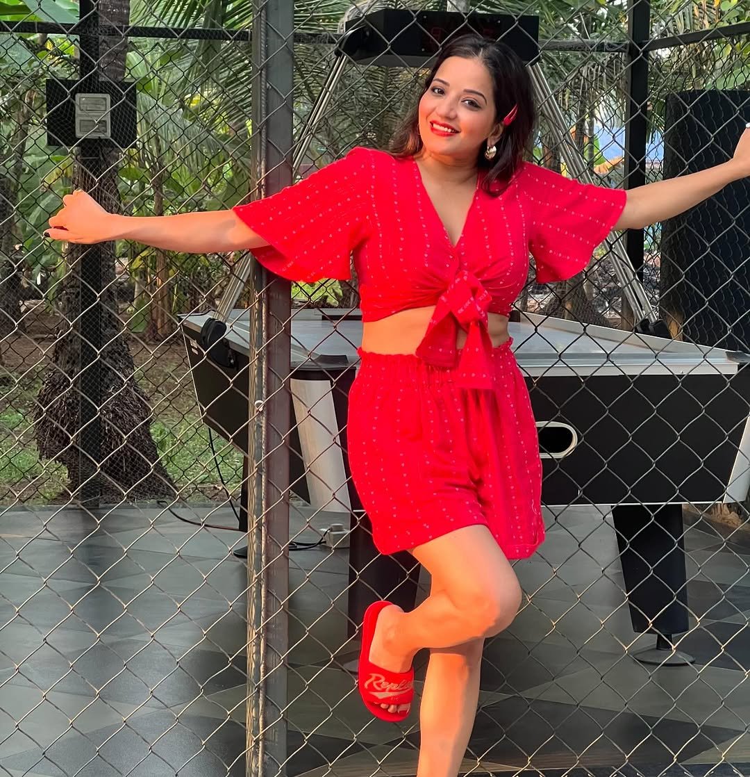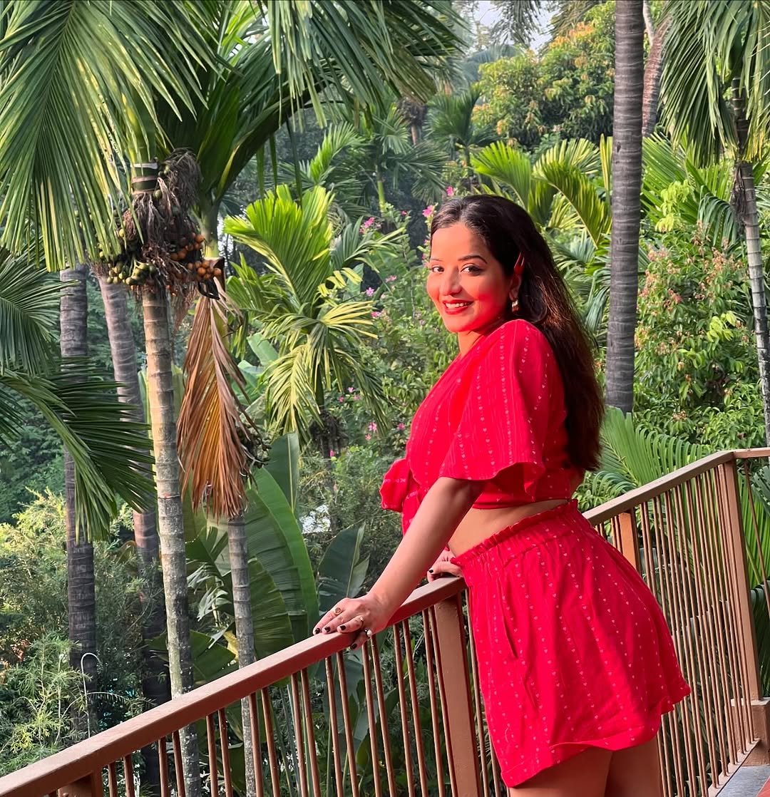 In these pictures of Monalisa, you can see that she is wearing a very sexy outfit of red color, in which she is looking very beautiful and glamorous.