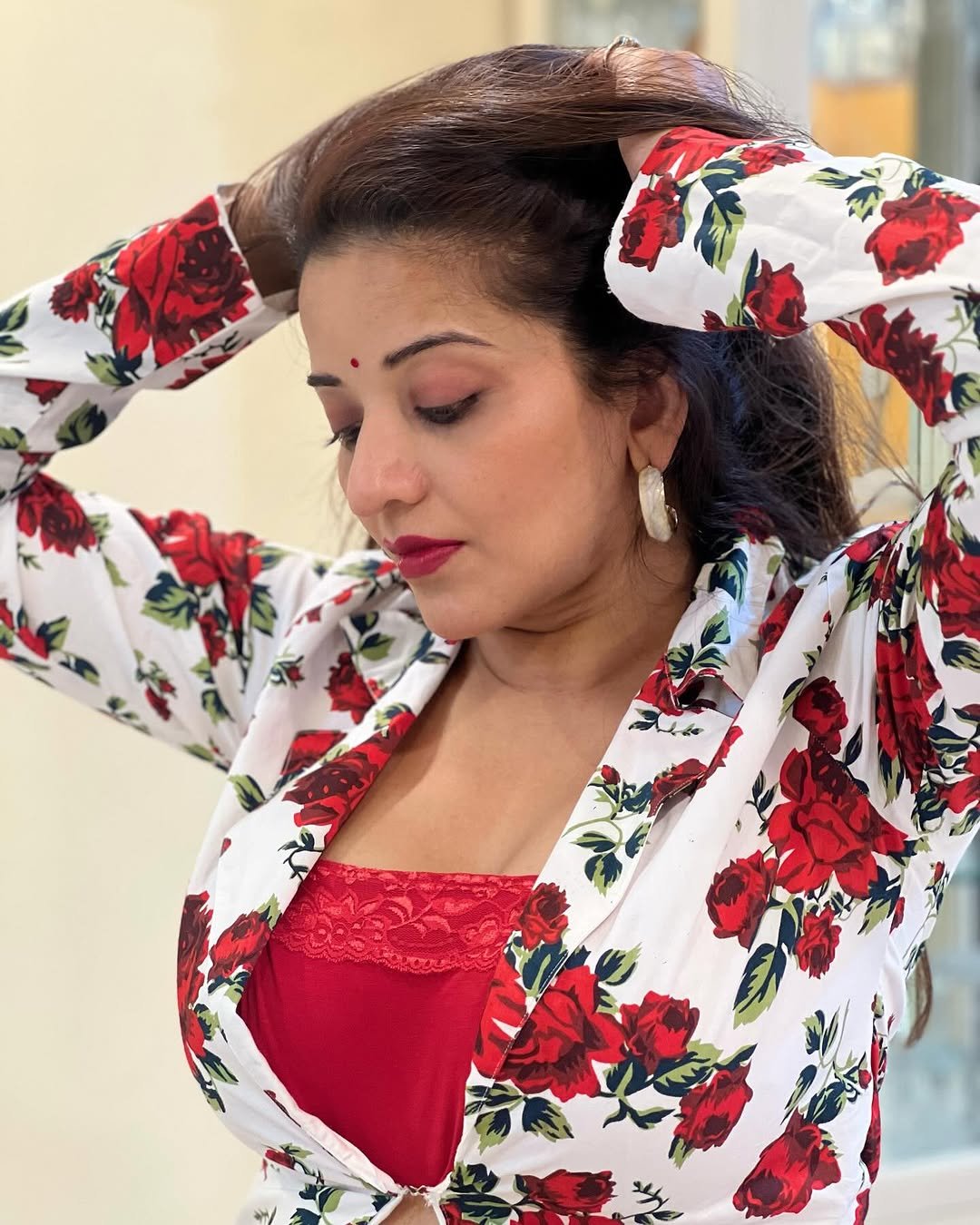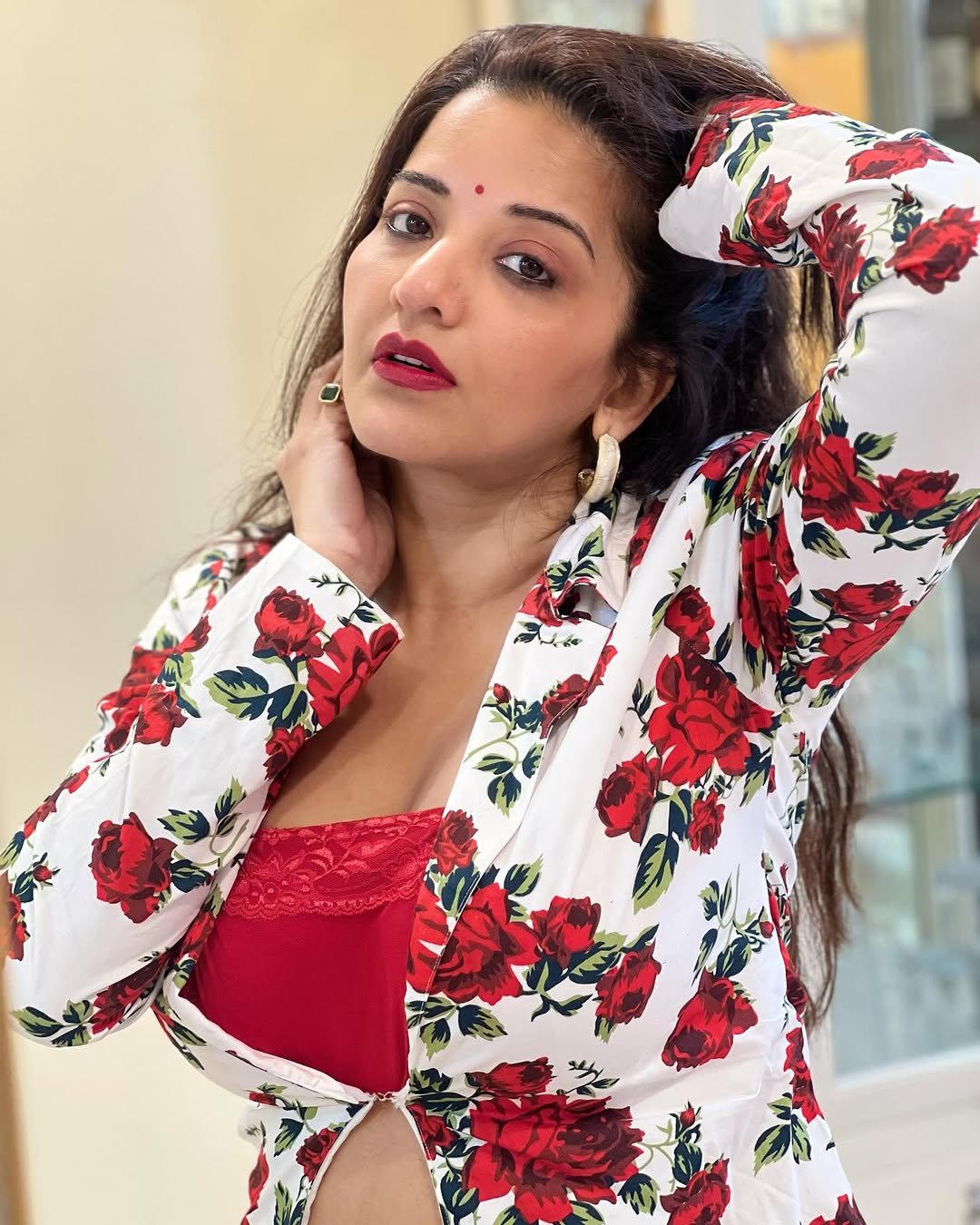 In these pictures of Monalisa, you can see that she is wearing a very sexy outfit of white and red color, in which she is looking very beautiful and glamorous.