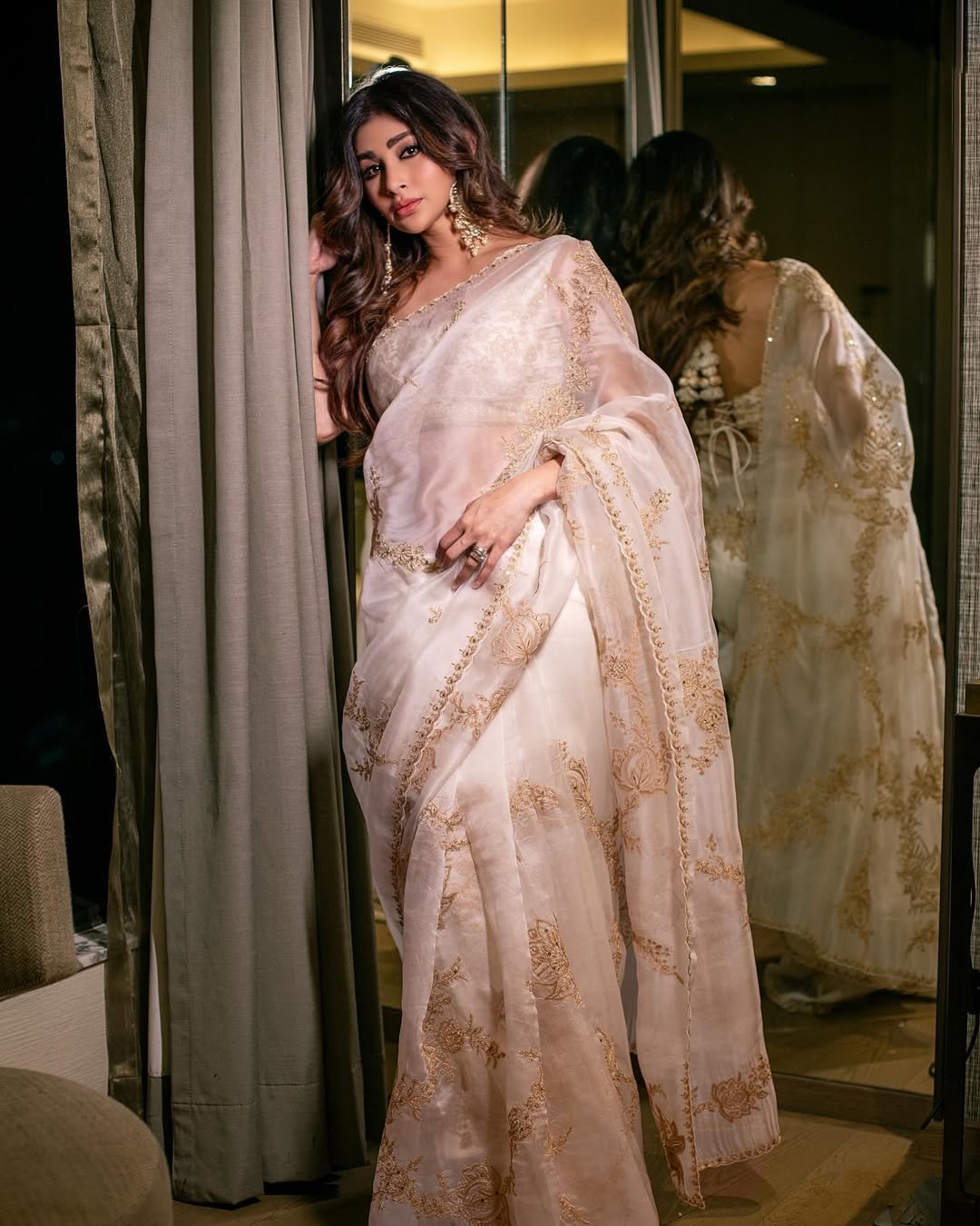 In one picture, Mouni Roy is also flaunting her earrings with her saree.