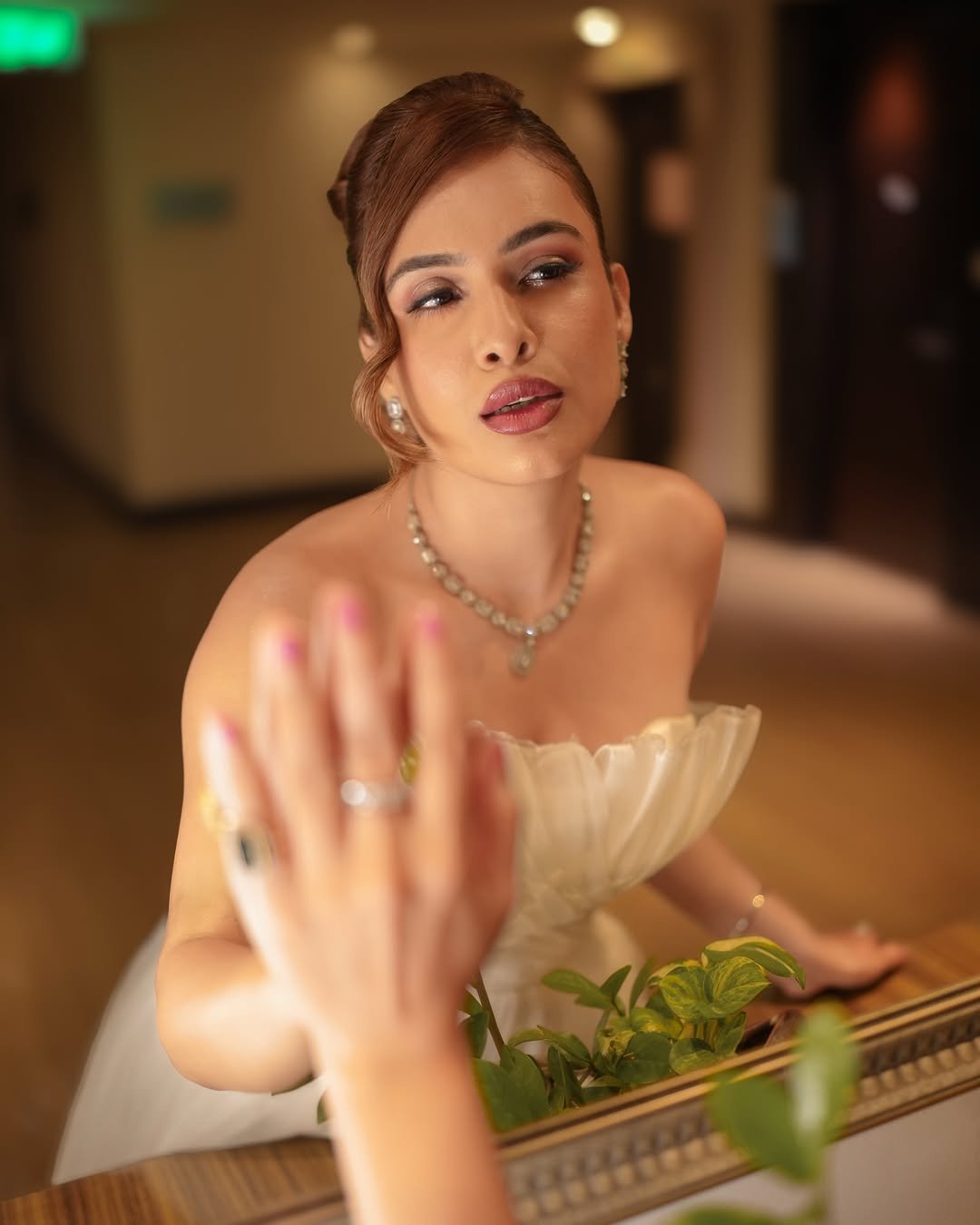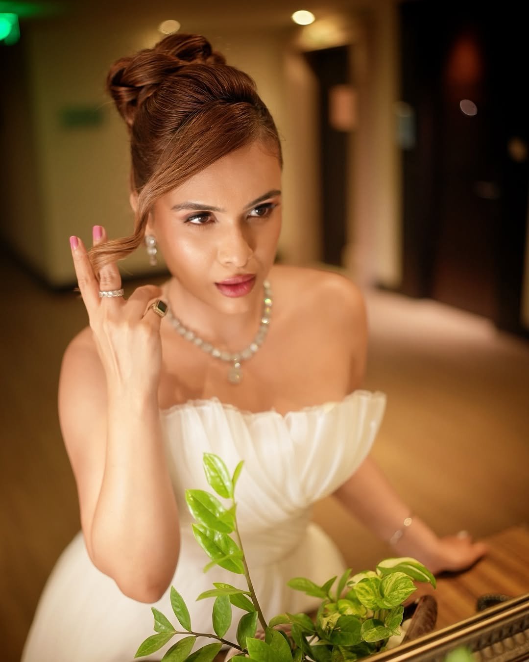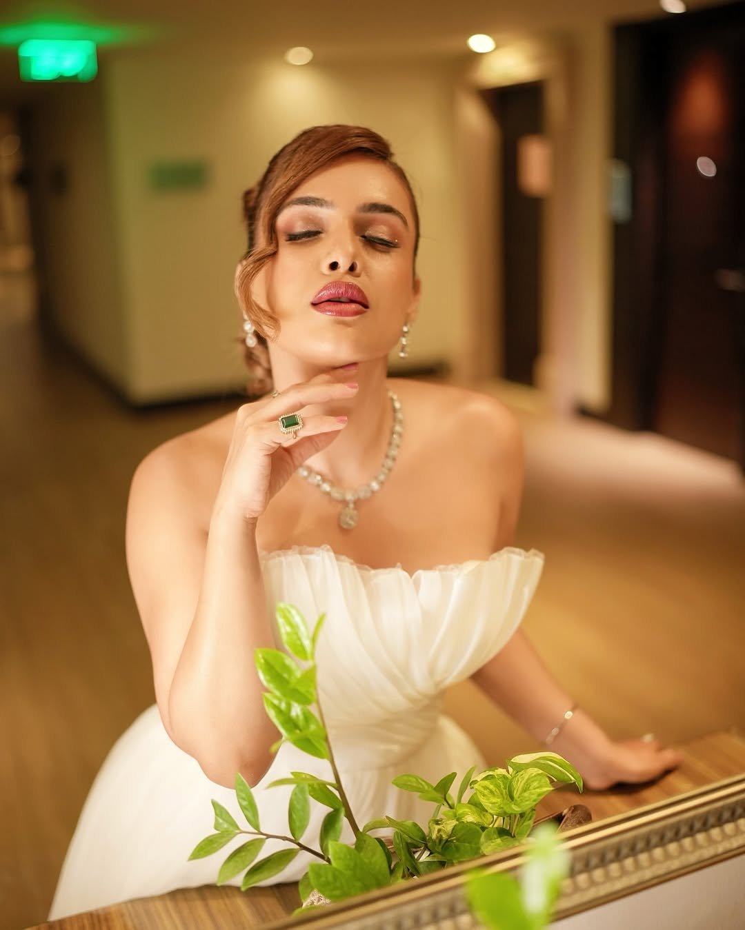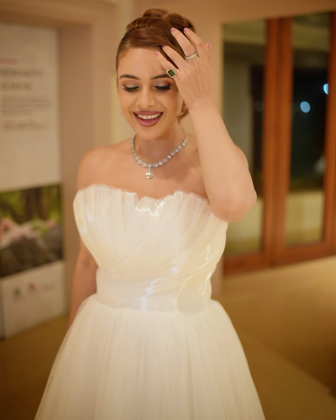 Neha gave many lovely poses in a white off-shoulder one-piece dress.