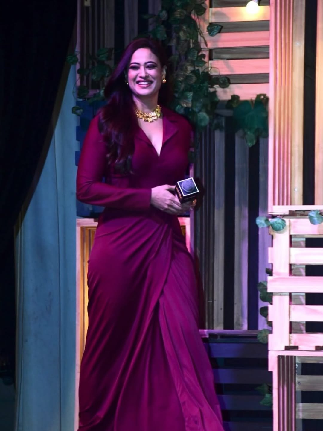 Shweta Tiwari wore a silver-colored shimmery dress, which sparkled.