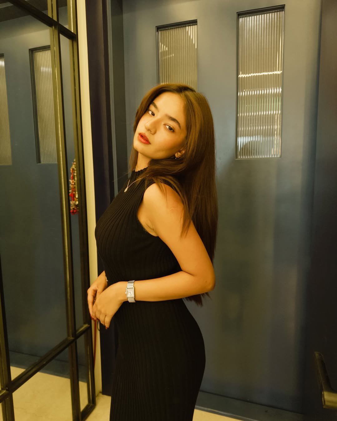 In these pictures, the actress is seen wearing a black color modern dress.