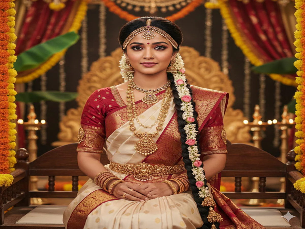 Poola Jada: The bride's long braid is completely covered with garlands of fresh flowers (jasmine, rose, and marigold).