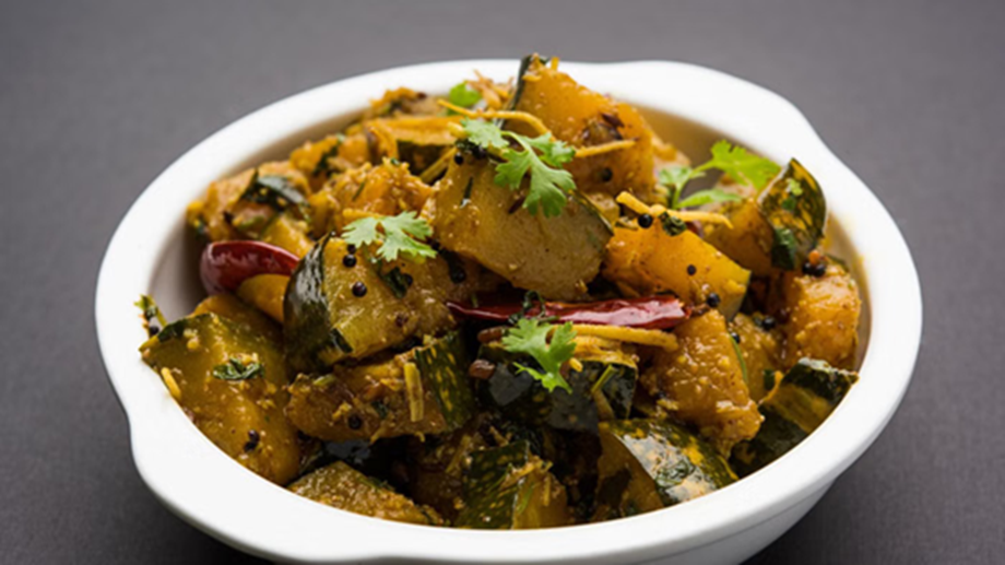 Prepare the sweet and sour pumpkin for your vegetarian thali. First, heat oil in a pan and temper with cumin seeds. Then, add pumpkin, turmeric, coriander powder, and salt. Add a little water and cover. When the pumpkin softens, add jaggery and dry mango powder and cook for 2 minutes. The pumpkin is ready.