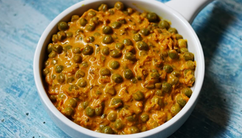 - Let the curd mixture and spices cook for 3-4 minutes while stirring. After this, add fried turmeric and peas to it.